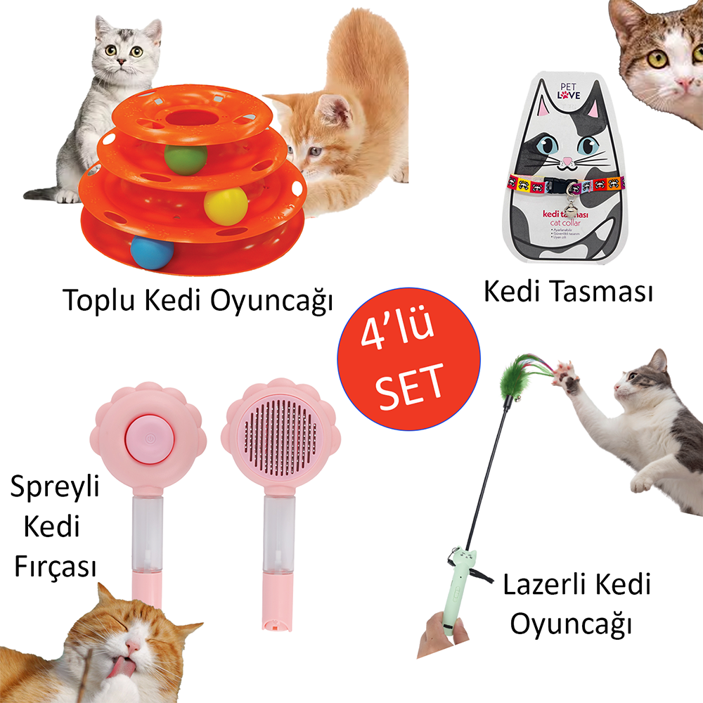 4'lü Set 3 Katlı Toplu Kedi Oyuncağı + Spreyli Kedi Fırçası + Lazerli Kedi Oyuncağı ve Kedi Tasması