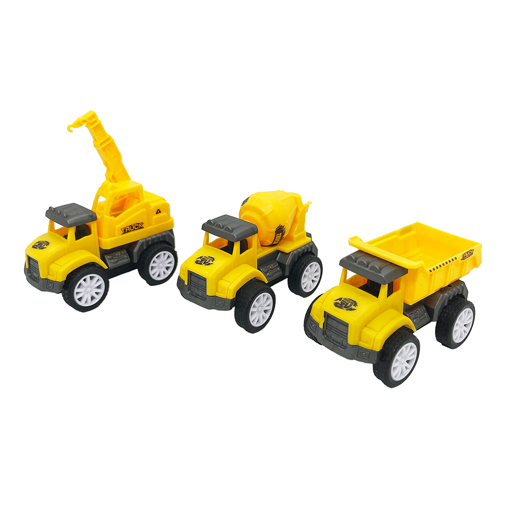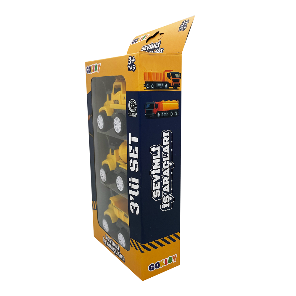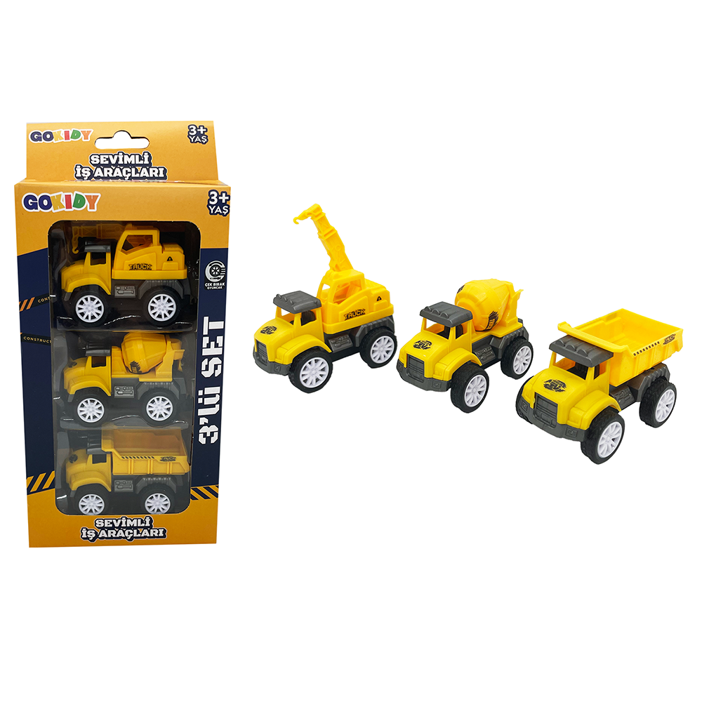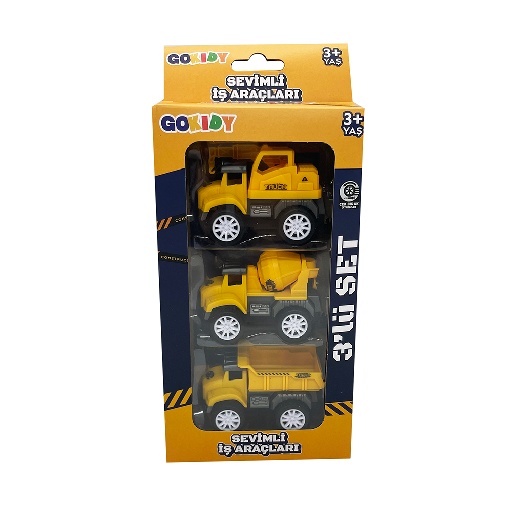 Set, üç farklı iş makinesi içerir her biri çocuklar için eğlenceli ve renkli tasarımlara sahiptir