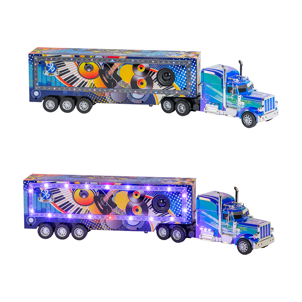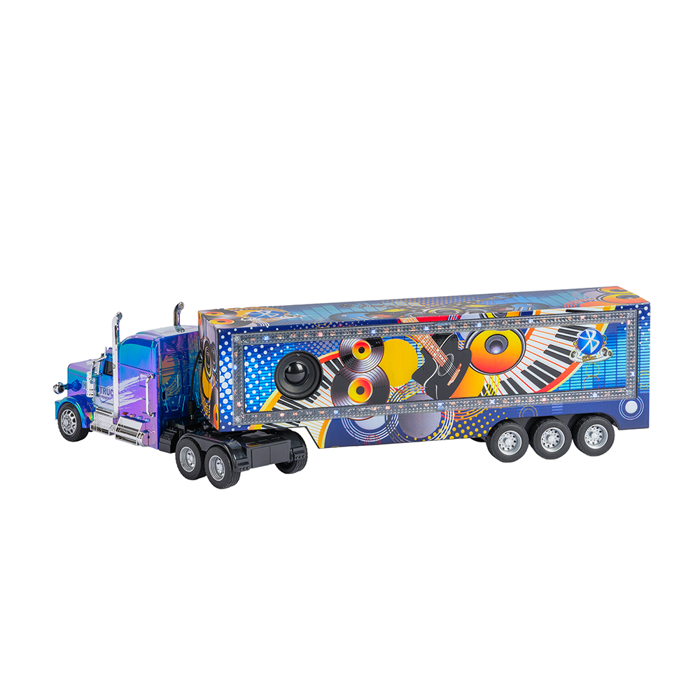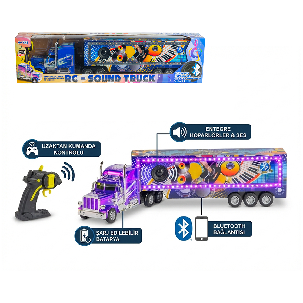 Eğlenceyi ve müziği bir araya getiren RC Sound Truck, ışık efektleri, müzik fonksiyonları ve uzaktan kumanda kontrolü ile çocuklara interaktif bir oyun deneyimi sunar. Renkli tasarımı ve sahne konseptli dorsesi sayesinde hem görsel hem işitsel olarak dikkat çeker
