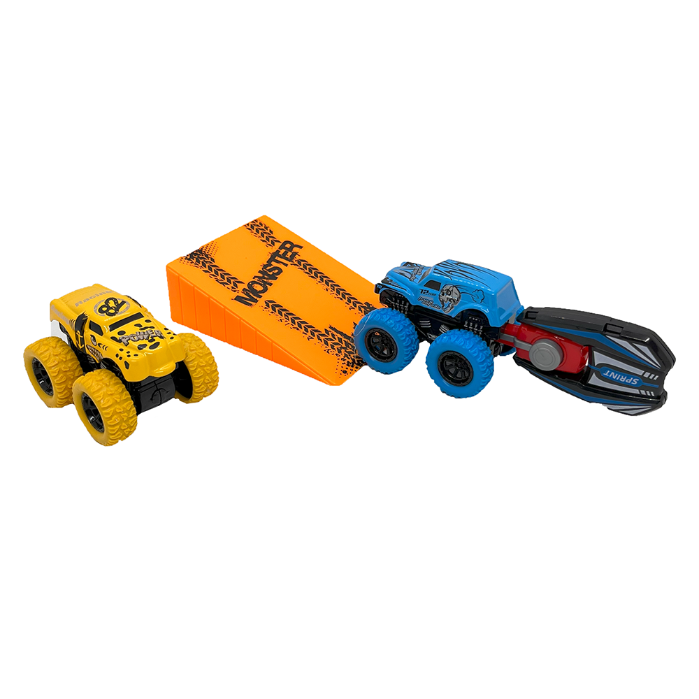Metal Fırlatıcılı Rampalı Monster Truck 2'li Set - Sarı-Mavi